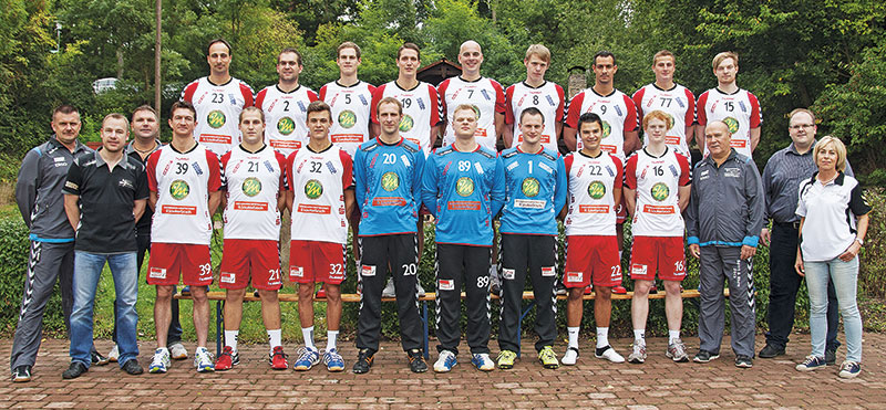 vorne v. l.: Christian Raaz - Torwarttrainer, Winfried Wagner - Betreuer, Harald Schneider - Betreuer, Renè Hermann, Jean-Marie Sandrock, Christian Mudrak, Marco Pajung, Alexander Dick, Lucas Nuhn, Achim Birkel, Philipp Koch, Hans-Joachim Ursinus - Trainer, Thomas Bodenbender - Leiter der HSG, Andrea Dett - Physiotherapeutin.